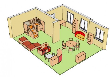 - Raumplan-Vorentwurf - Grobe Grundrissplanung mit Platzierung und Stellung der jeweiligen Möbel und Einrichtungszonen wie z.B. im Gruppenraum Essecke, Rollenspielecke, Bauecke, Puppenspielbereich oder 2. Ebene.